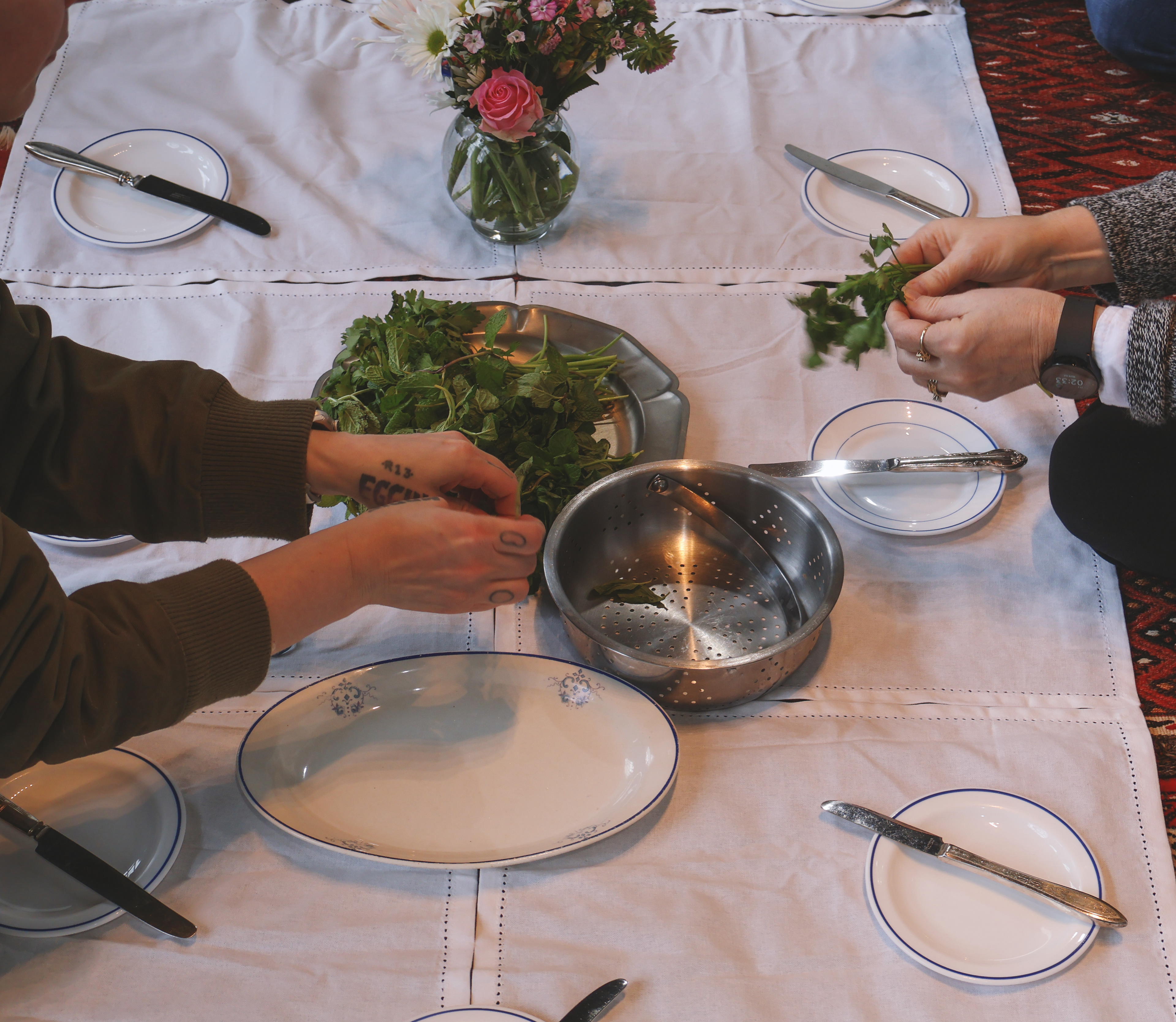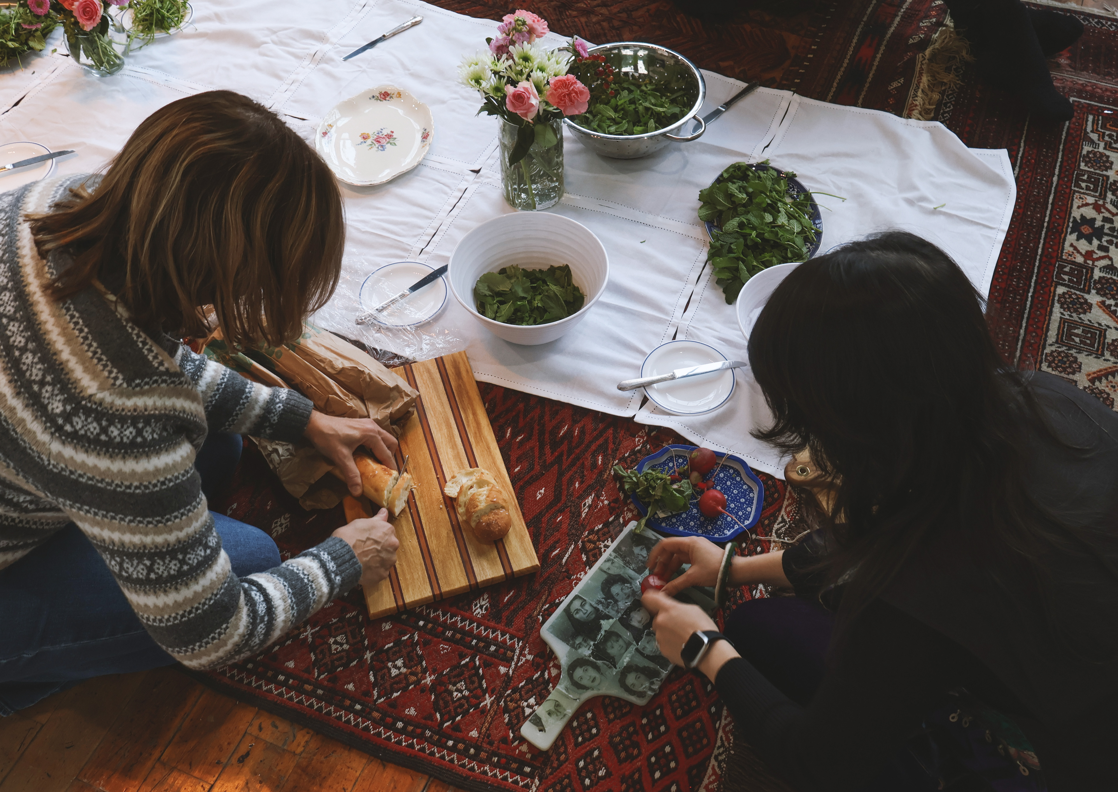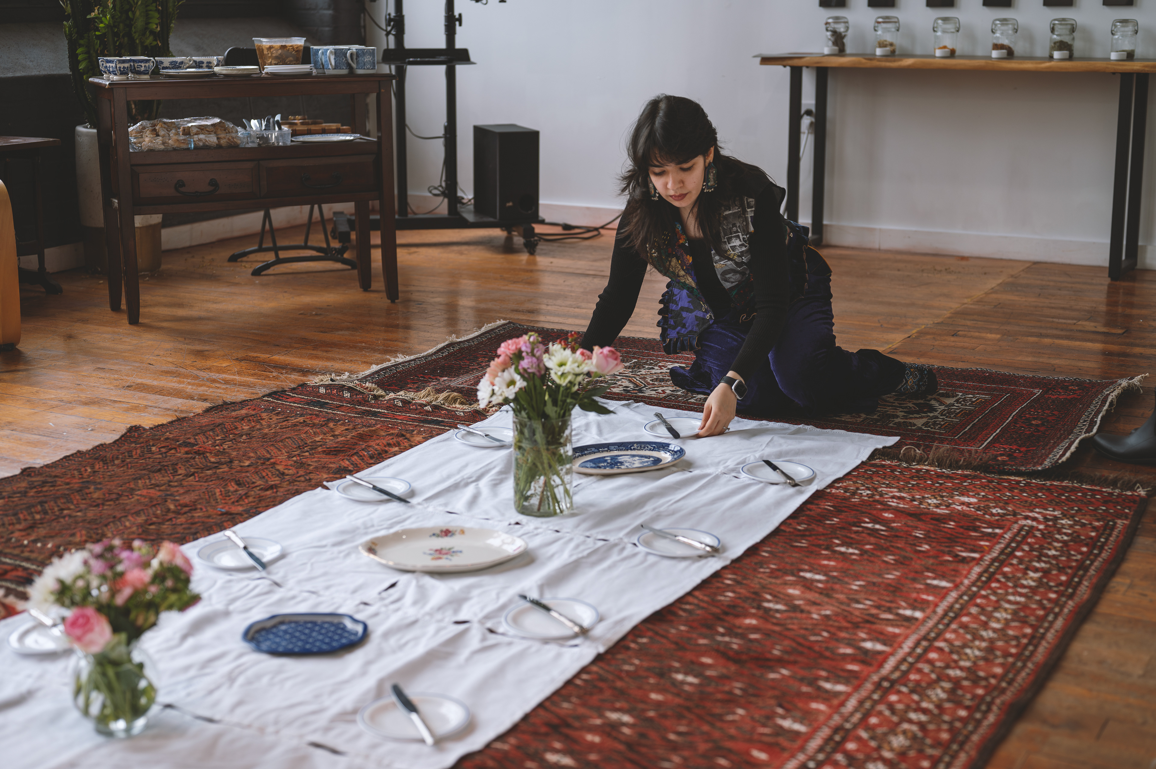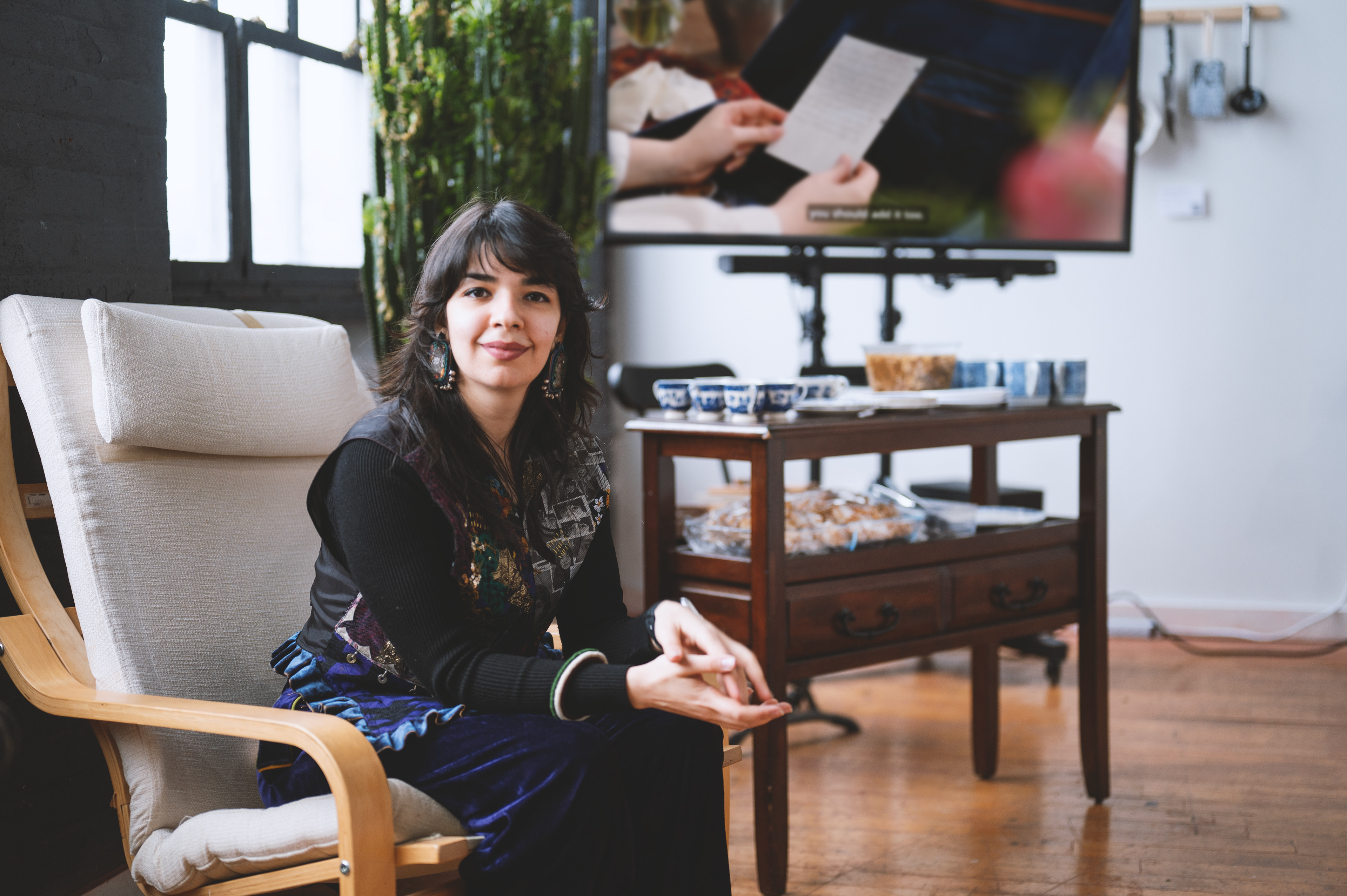 The experience begins by screening a five-minute short film from her cookbook project, Ja Oftadan (‘Settle In’). After the film, attendees are invited into a warm ritual of togetherness: sitting on Persian rugs (no shoes on!), cleaning fresh herbs, preparing a simple Iranian snack — noon, panir, sabzi — and sharing tea and sweets.