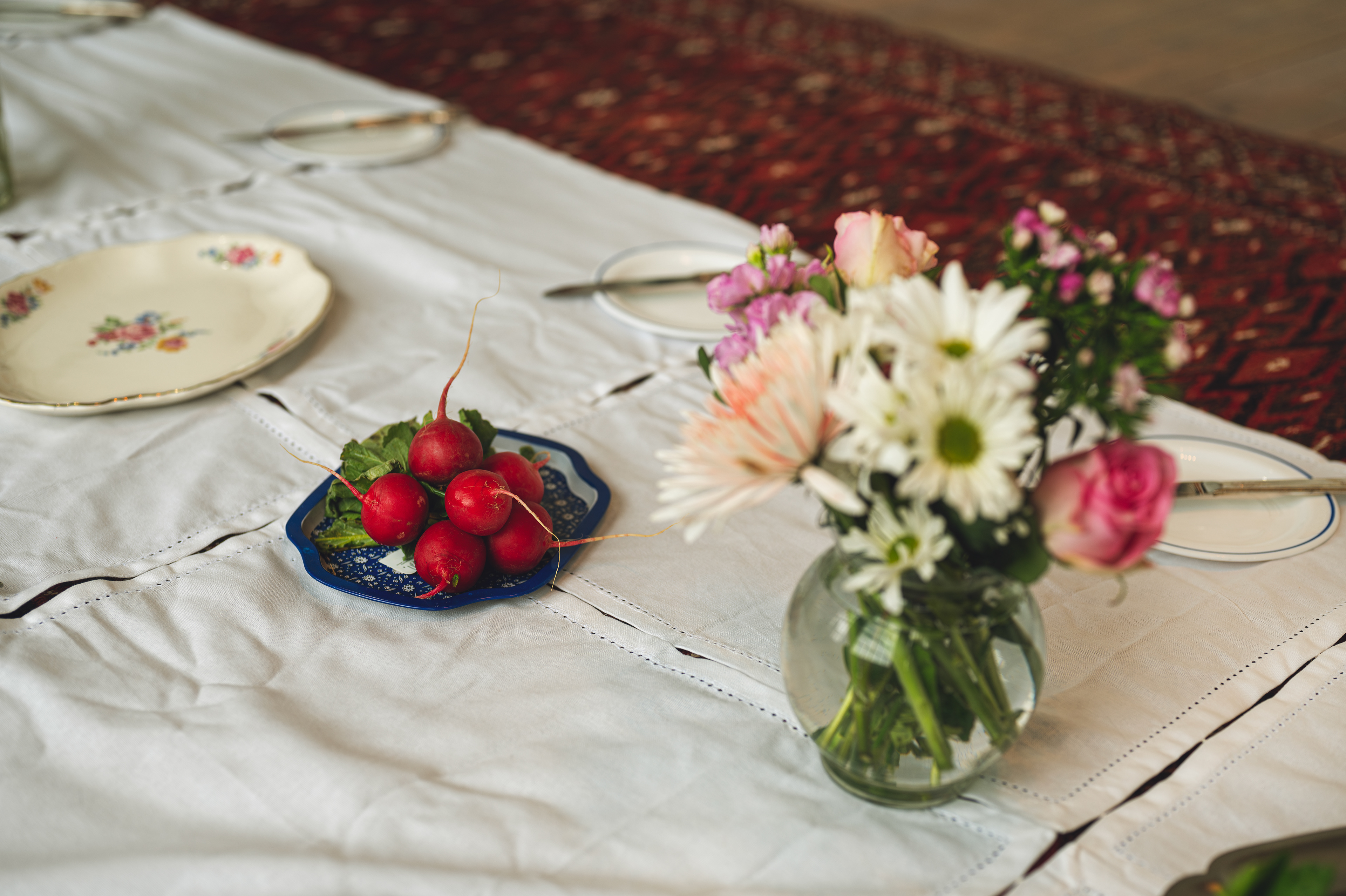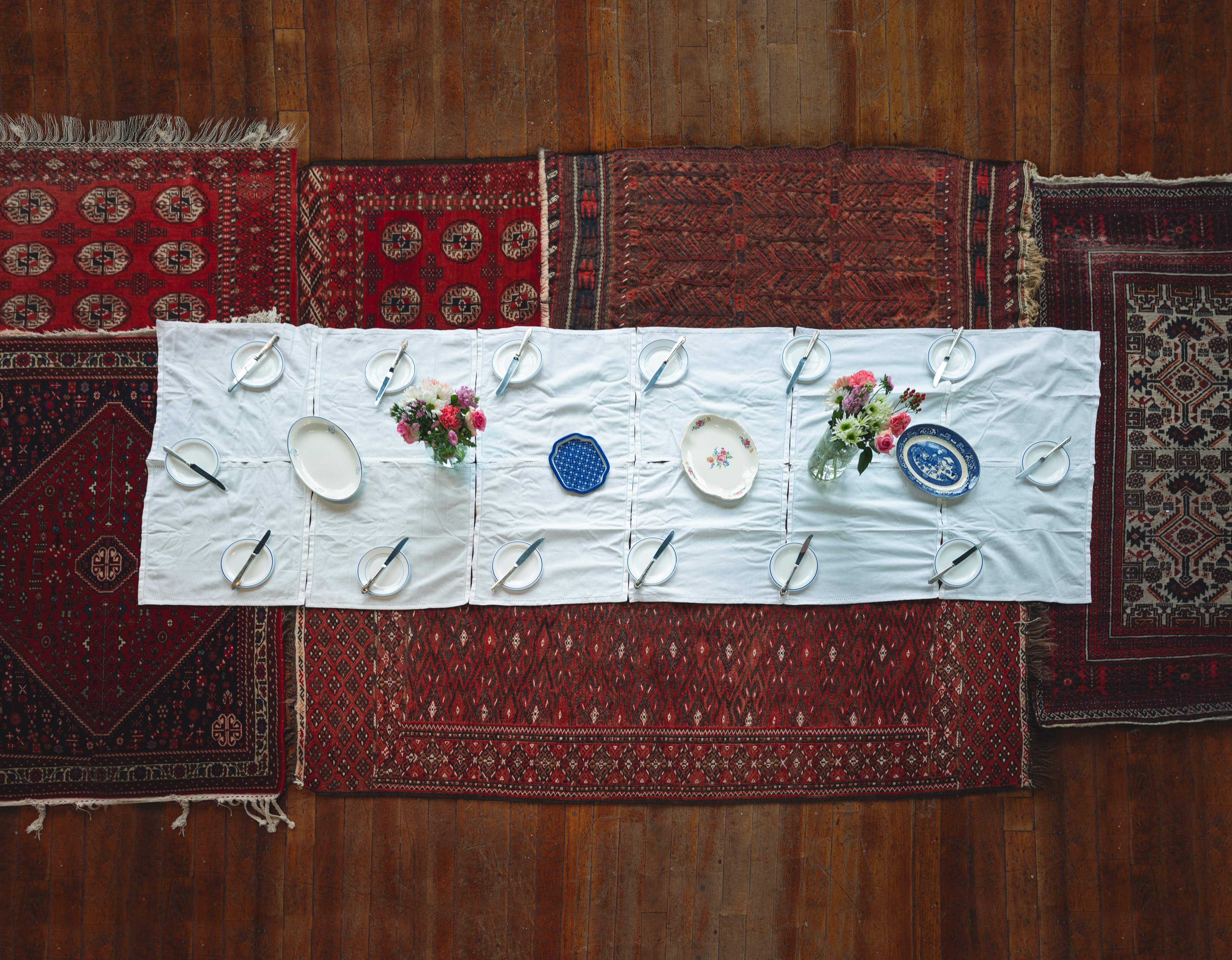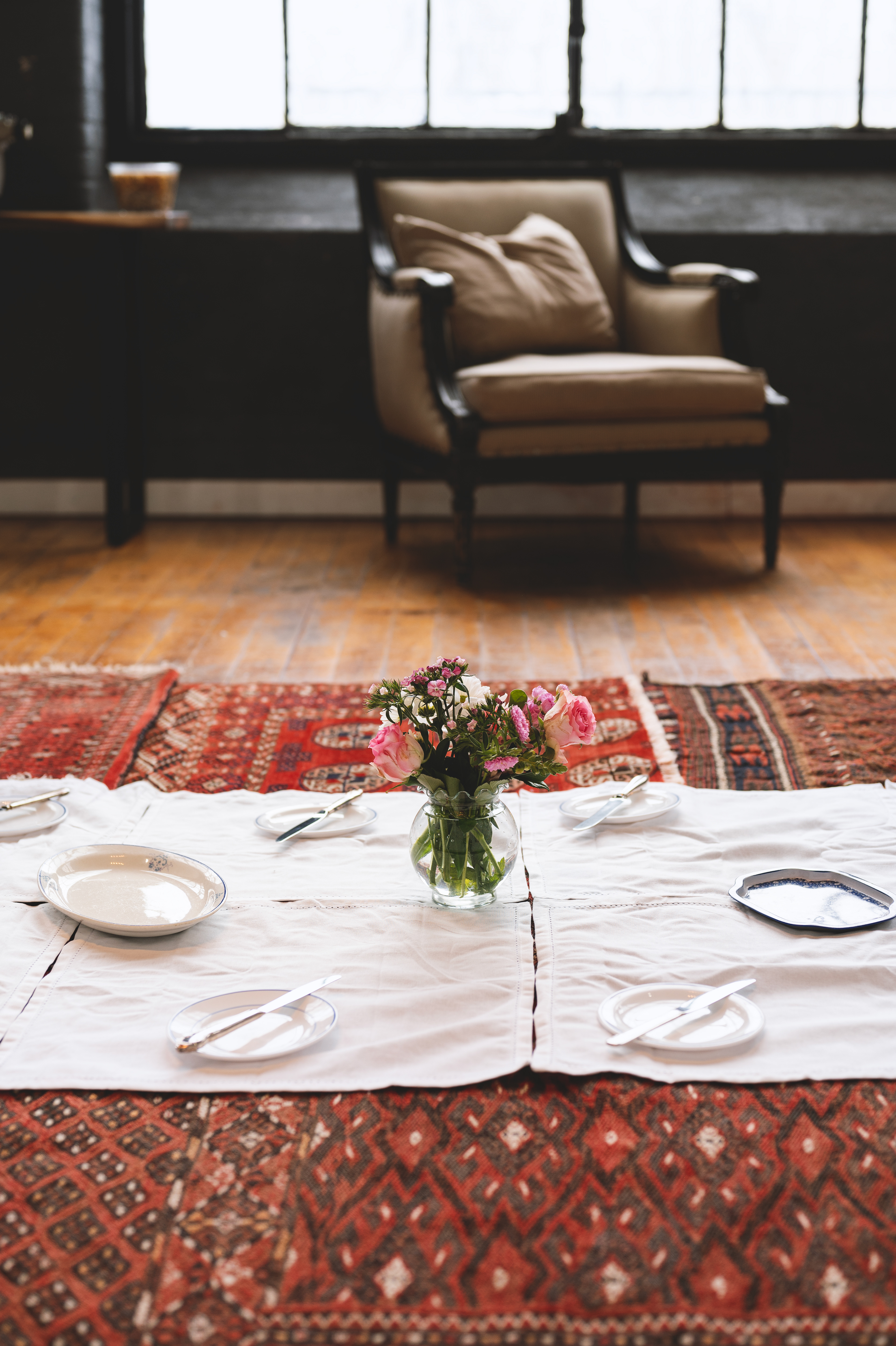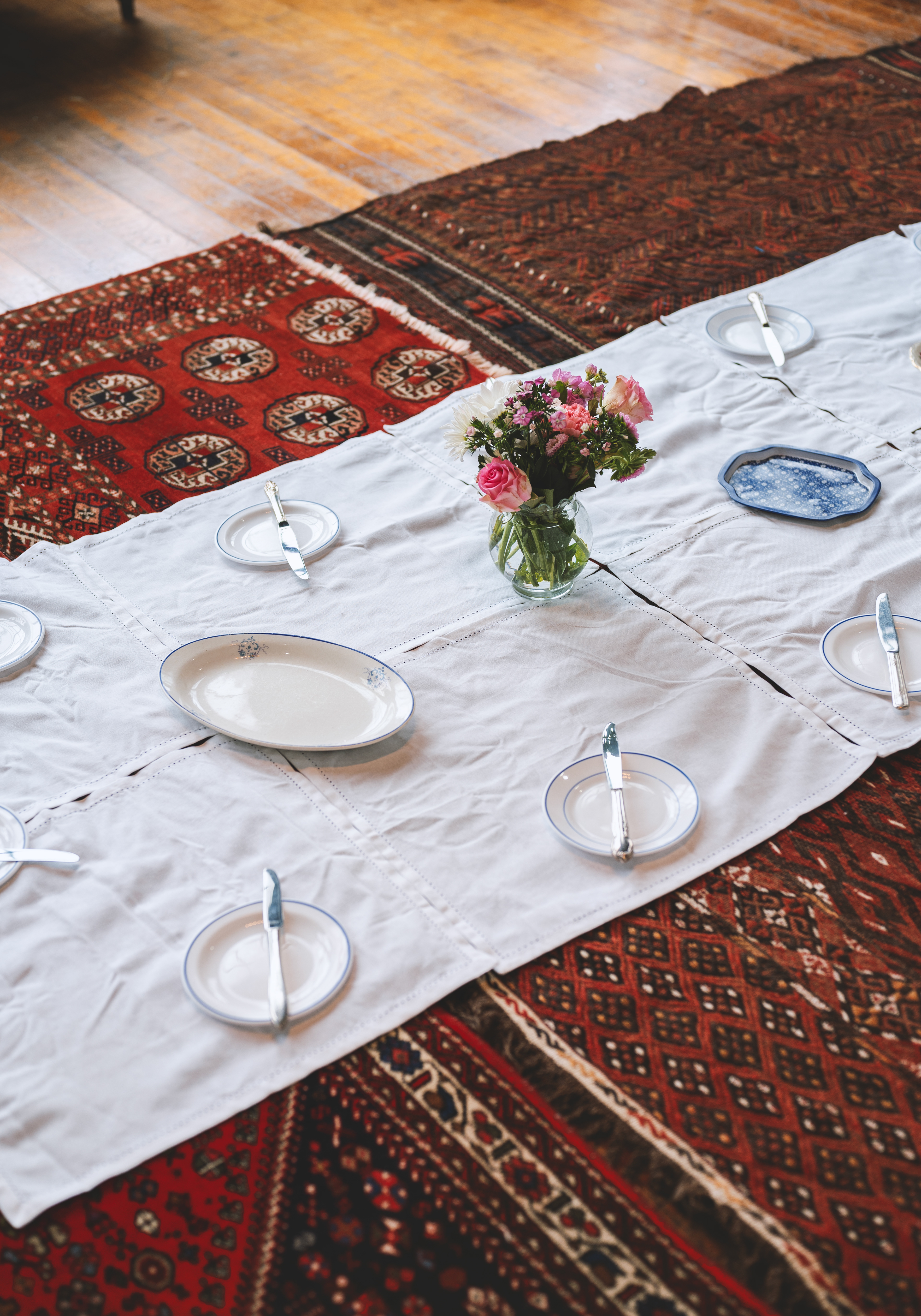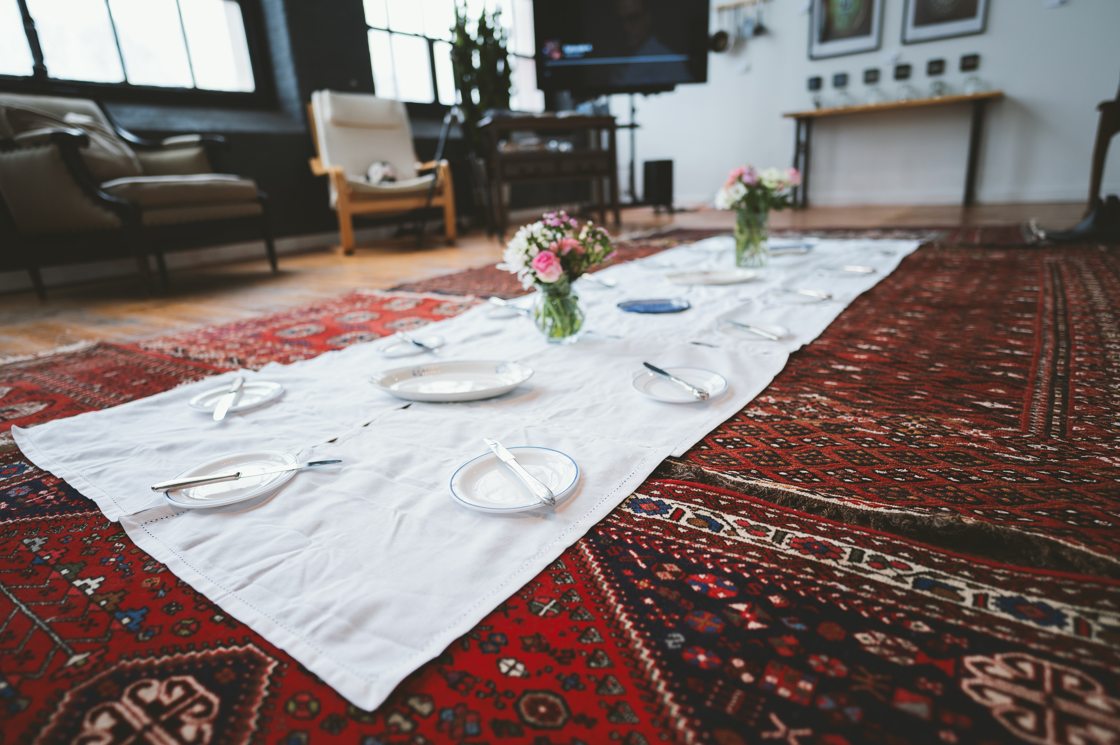The experience begins by screening a five-minute short film from her cookbook project, Ja Oftadan (‘Settle In’). After the film, attendees are invited into a warm ritual of togetherness: sitting on Persian rugs (no shoes on!), cleaning fresh herbs, preparing a simple Iranian snack — noon, panir, sabzi — and sharing tea and sweets.